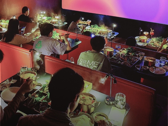 四川省成都市的三克映畫影院內(nèi),觀眾在邊吃火鍋邊看電影。三克映畫供圖