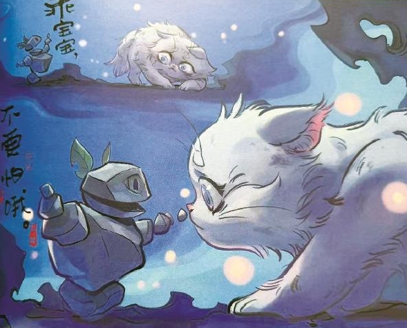 繪本故事中,石磯娘娘住的山里闖進(jìn)了一只小貓咪,魔鏡告訴她高大的樣子可能會嚇到貓咪,于是她就變成小石頭人的樣子與貓咪成了好朋友(見上圖),她還給小貓咪起名叫“虎子”。有一天她和貓咪玩耍的時(shí)候碰見了一只野獸,為了保護(hù)小貓咪,她恢復(fù)了高大的樣貌嚇跑了野獸,也嚇跑了“虎子”。于是石磯娘娘又變成了孤身一人,直到有天小貓回來,告訴她自己找到了媽媽,真的要離開山里了,石磯娘娘則含淚與小貓做了正式的告別。暖心的故事看哭了很多觀眾。