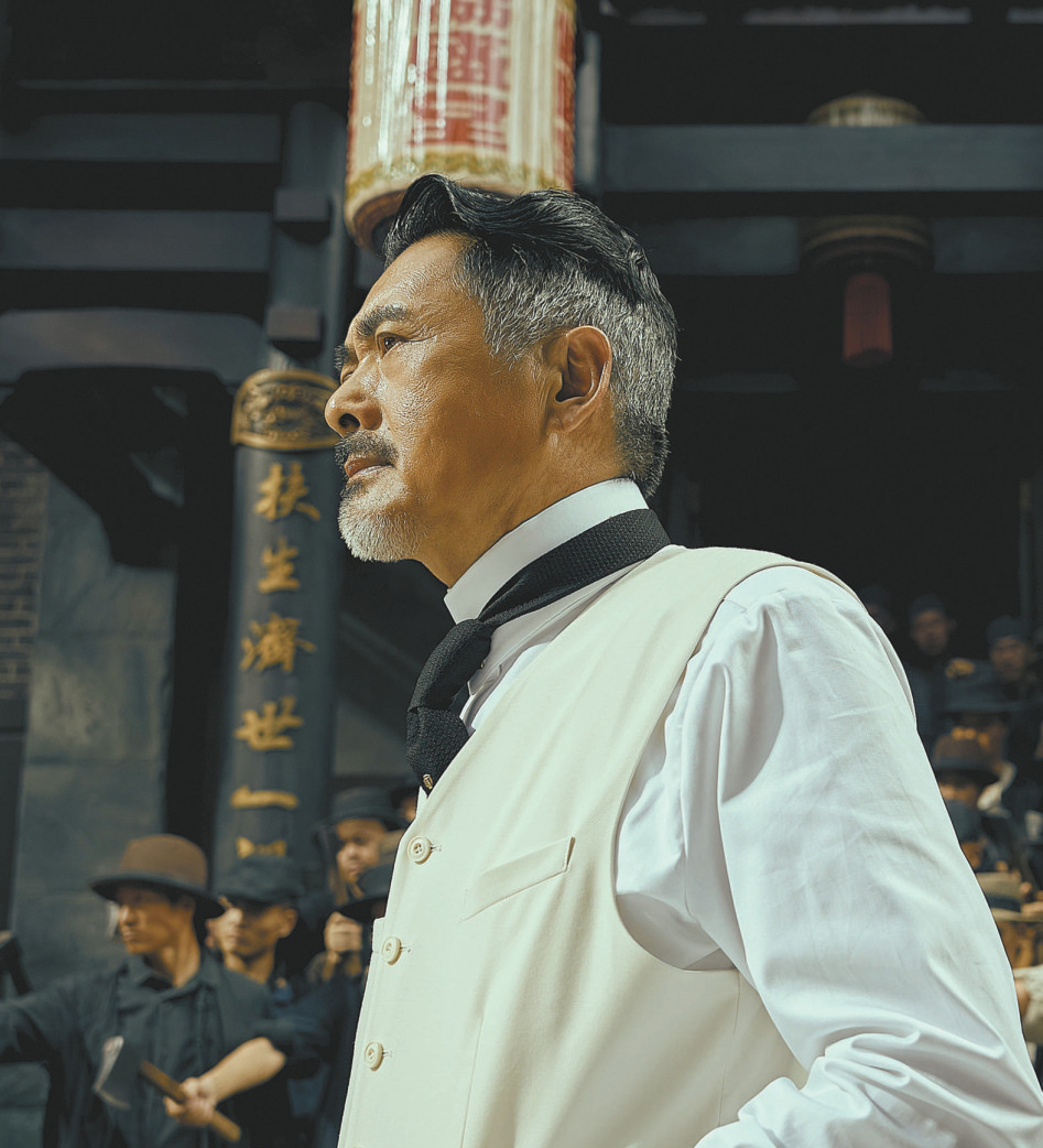 可以說《唐探1900》真正的主角,這次不是兩位偵探,而是白軒齡、白振邦父子,他們的經(jīng)歷和立場在早期第一、第二代華人移民中具有代表性。周潤發(fā)飾演的白軒齡作為最早到舊金山的淘金者、修建太平洋鐵路的幸存者,可謂華工血淚史的書寫者和見證者。同時他又是復(fù)雜的,既有手腕又長袖善舞,黑白通吃,通過暴力和權(quán)錢交易自保,但也讓唐人街藏污納垢,連親兒子都難以忍受。而從他給兒子起名“振邦”來看,白軒齡內(nèi)心也希望祖國一掃積貧積弱,海外僑民才能挺直腰桿,但他又不愿付出“拋頭顱灑熱血”的犧牲,只能深陷一種矛盾平衡之中。而白振邦(張新成 飾)、鄭仕良(白客 飾)等年輕一代,則選擇一腔熱血奔赴革命,同《十月圍城》《走向共和》里那樣“一代人去做一代人的事情”,成為全片最令人欽佩和振奮的群體。