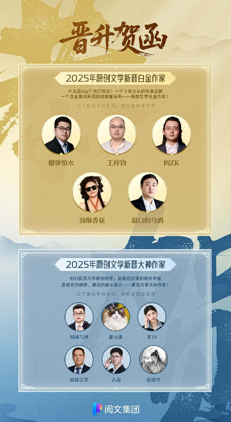 7月15日,閱文集團發(fā)布2025年度“白金大神”作家名單,榴彈怕水、王梓鈞、閻ZK、油爆香菇、最白的烏鴉5名作者獲“白金作家”稱號,城城與蟬、董無淵、非10、孤獨麥客、古羲、誤道者6名作者獲“大神作家”稱號。