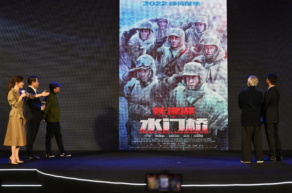 電影《長(zhǎng)津湖之水門橋》2021年在廈門舉行新聞發(fā)布會(huì),黃建新(左三)為總監(jiān)制。新華社記者 林善傳 攝