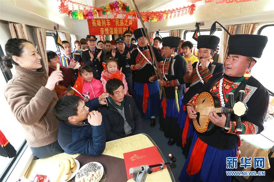 2月1日,彝族藝術(shù)家在K165次列車上為旅客表演。當(dāng)日,在西安鐵路局西安至昆明的K165次列車上,四川美姑縣原生態(tài)畢摩樂隊與西安客運段職工民樂小分隊聯(lián)合舉辦“英雄列車民族之聲親情溫暖回家路”音樂會,畢摩樂隊用口弦、哈門、木葉、瑪布等彝族民間樂器演奏的音樂為返鄉(xiāng)過年的旅客提前送上新年祝福。民間藝術(shù)家和列車乘務(wù)員還為旅客們送上“?!弊帧⒋郝?lián)。新華社發(fā)