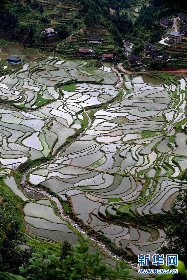 5月20日在廣西柳州市融水苗族自治縣桿洞鄉(xiāng)拍攝的梯田。廣西柳州市融水苗族自治縣桿洞鄉(xiāng)平均海拔780多米,是全縣高海拔鄉(xiāng)鎮(zhèn)之一。這里的梯田多在高山,人們稱(chēng)之為“天上糧倉(cāng)”。時(shí)下,“天上糧倉(cāng)”或儲(chǔ)水待插,或新秧初栽,如織錦一般美不勝收。新華社發(fā)(龍濤 攝)