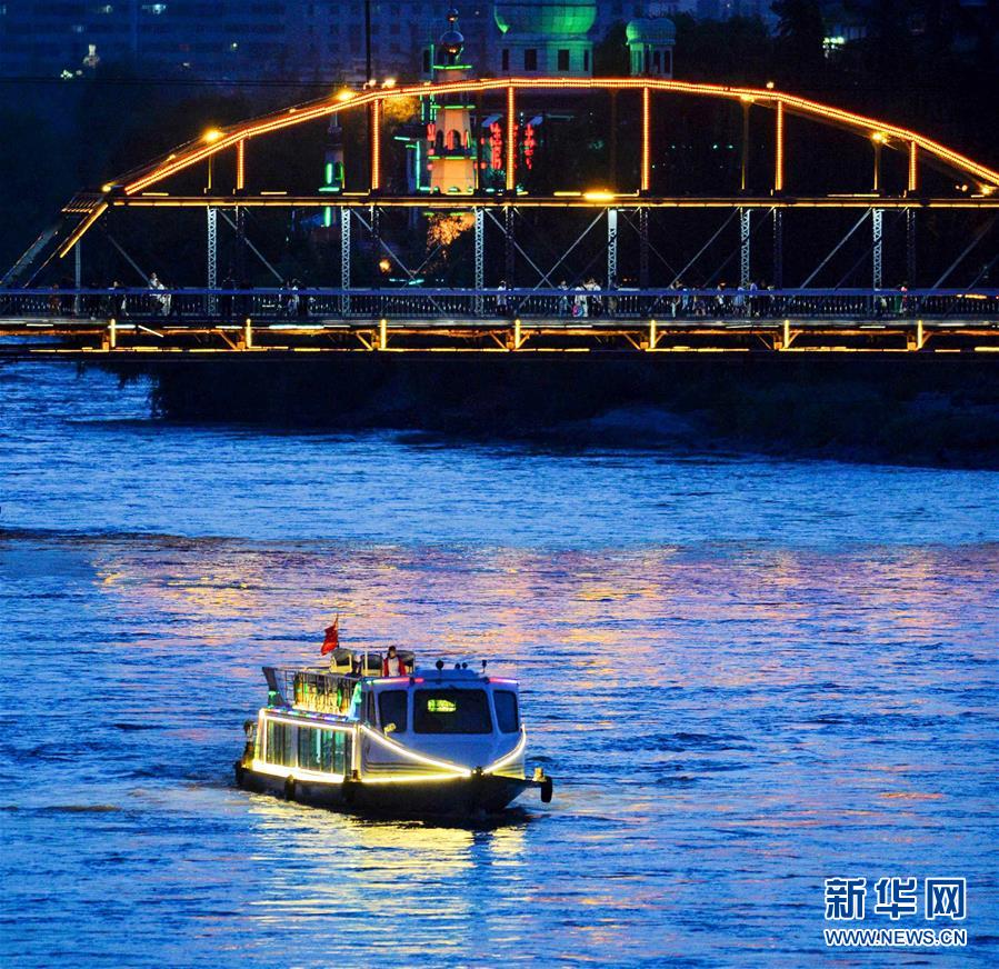 6月14日,一艘游輪從黃河蘭州段中山橋下穿過。自6月12日起,蘭州黃河游輪夏季夜航航線正式開通。據(jù)了解,作為黃河蘭州段水上旅游重點(diǎn)線路,該航線由蘭州市城關(guān)區(qū)蘭州港碼頭和白塔山碼頭始發(fā),每晚20時(shí)起開行,全程約6公里,運(yùn)行時(shí)長50分鐘左右。游客可以乘坐豪華游輪欣賞黃河夜景,感受蘭州黃河風(fēng)情線別樣魅力。新華社記者 陳斌 攝