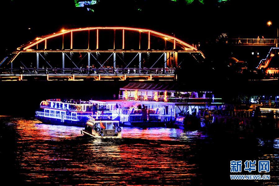 6月14日,一艘游輪從黃河蘭州段中山橋下穿過。自6月12日起,蘭州黃河游輪夏季夜航航線正式開通。據(jù)了解,作為黃河蘭州段水上旅游重點(diǎn)線路,該航線由蘭州市城關(guān)區(qū)蘭州港碼頭和白塔山碼頭始發(fā),每晚20時起開行,全程約6公里,運(yùn)行時長50分鐘左右。游客可以乘坐豪華游輪欣賞黃河夜景,感受蘭州黃河風(fēng)情線別樣魅力。新華社記者 陳斌 攝