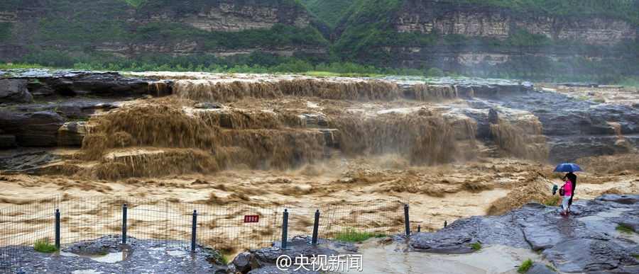 受上游強(qiáng)降雨和水庫放水影響,最近幾天,黃河壺口瀑布迎來伏汛,最大水流量達(dá)到每秒2600立方米左右,濁流滾滾奔騰而下,氣勢磅礴!(央視記者李志 文豪)