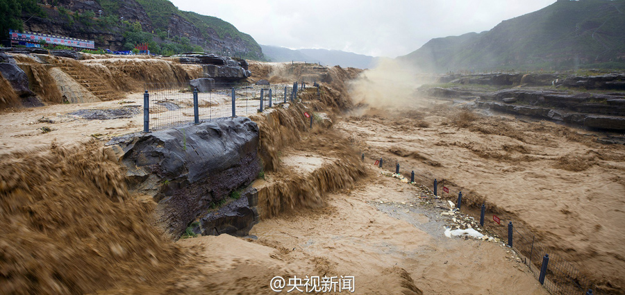 受上游強(qiáng)降雨和水庫(kù)放水影響,最近幾天,黃河壺口瀑布迎來(lái)伏汛,最大水流量達(dá)到每秒2600立方米左右,濁流滾滾奔騰而下,氣勢(shì)磅礴?。ㄑ胍曈浾呃钪?文豪)