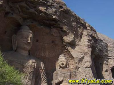 云岡石窟位于山西省大同市以西16公里處的武周山南麓。石窟始鑿于北魏興安二年(公元453年),大部分完成于北魏遷都洛陽之前(公元494年),造像工程則一直延續(xù)到正光年間(公元520~525年)。石窟依山而鑿,東西綿亙約1公里,氣勢恢弘,內(nèi)容豐富。現(xiàn)存主要洞窟45個,大小窟龕252個,石雕造像51000余軀,最大者達17米,最小者僅幾厘米??咧衅兴_、力士、飛天形象生動活潑,塔柱上的雕刻精致細(xì)膩,上承秦漢(公元前221年~公元220年)現(xiàn)實主義藝術(shù)的精華,下開隋唐(公元581~907年)浪漫主義色彩之先河,是世界聞名的石雕藝術(shù)寶庫之一。1961年國務(wù)院公布為全國重點文物保護單位,2001年被列為世界文化遺產(chǎn)。