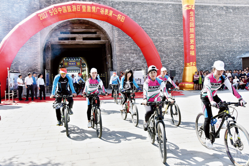 活動中,旅行社代表發(fā)言,旅行社導(dǎo)游集體宣誓,旅行社負責(zé)人和導(dǎo)游集體簽署文明旅游承諾書。啟動了捷安特騎行隊騎游??h文化藝術(shù)館舉辦了“激情廣場表演——懷舊專場”演出,節(jié)目有舞蹈、獨唱、晉劇選段、吉他彈奏、勁舞、歌伴舞、詩朗誦、水兵舞、旗袍秀等,贏得現(xiàn)場觀眾陣陣熱烈的掌聲,將“5·19中國旅游日”宣傳活動推向了高潮。圖為捷安特騎行隊出發(fā)騎游(石俊文 攝影報道)