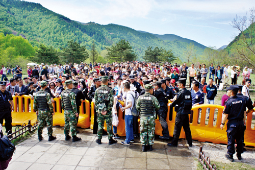 5月18日深夜,隨著三個(gè)入山口人流的驟增,原定22時(shí)30分上崗的民警提前到20時(shí)全部到位。23時(shí)40分,記者來(lái)到南線游客中心,只見潮水般的人群涌向售票大廳,不少公安民警在安監(jiān)門口嚴(yán)密把守,有序放行,站在臺(tái)階上的民警手舉超大口徑的大喇叭向嘈雜擁擠的人海不斷地呼喊:“不要擁擠,有序排隊(duì)!”在游客中心東邊的交通要道上,全副武裝的交通民警正在緊張地疏導(dǎo)川流不息的車輛。19日1時(shí)燈光下,記者看到擔(dān)任此次安??傊笓]的市公安局局長(zhǎng)楊梅喜在寒風(fēng)中與民警一道指揮交通。
