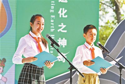 延慶世界地質(zhì)公園的小志愿者誦讀了設立“地質(zhì)公園日”的綠色倡議書攝影/本報記者 魏彤