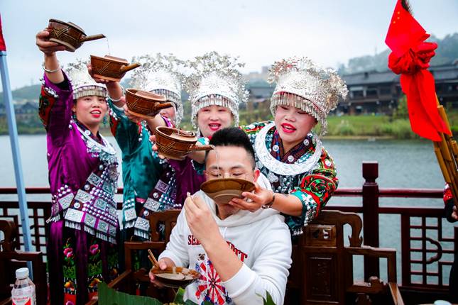 配合著各類美食,苗家春宴里不僅有十八道“攔門酒”、“高山流水”等花式敬酒,還有廣場迎賓舞、苗族八大支系盛裝巡游等多項苗、侗等少數民族的特色活動。其中最值得一提的,便是宴席開始前丹寨錦雞舞的表演,在苗族傳統(tǒng)蘆笙伴奏下,身著銀角冠服飾的苗族姑娘如錦雞般翩翩起舞,銀飾躍躍欲飛,銀角冠一點一搖,腿邊花帶一飄一閃,舞者步履輕盈,悠然搖擺,歡樂的氣氛讓人胃口大開。
