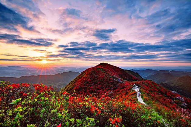 同樣選擇在薄霧初上的黎明出發(fā),順著龍泉山蜿蜒的石板路拾階而上,途徑一座古樸典雅的半山涼亭抵達山頂,眼前的奇觀如畫卷般徐徐展開:這是一片壯闊的云海,幾處鮮艷的杜鵑花叢在云霞中若隱若現,云海下隱藏著一整片杜鵑花海,延綿好幾公里,將龍泉山脈裝點得一派火紅,日出時東方天際噴涌而出的紅霞映照著云海杜鵑,仿佛給空氣鑲上了紅色濾鏡,一時間群山都變得奇幻瑰麗,這是丹寨龍泉山別具一格的云上杜鵑花?!坪2幌∑妫êR渤S?,云上花海卻是大多數人這輩子難得一見的奇觀,想親眼目睹嗎?