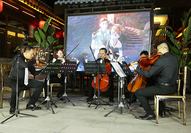 人民網(wǎng)忻州6月2日電(李夢(mèng)文)6月1日晚8點(diǎn)30分,華燈璀璨的忻州秀容古城突然傳來一陣優(yōu)美的西洋音樂,街邊游客循著音樂聲聚集到河曲院落?!讹L(fēng)中奇緣》《冰雪奇緣》《美女與野獸》《天空之城》《千與千尋》,隨著這一首首耳熟能詳?shù)臉非谝魳芳沂种辛魈识觯牨娨苍絹碓蕉?,越來越激?dòng)。