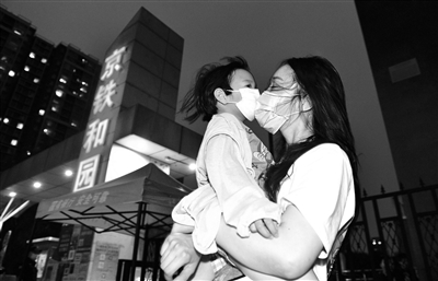 昨晚8點剛過,京鐵和園小區(qū)已有居民走出小區(qū),前往附近的超市、公園。在小區(qū)門口,3歲的多多老遠(yuǎn)就看到門外的媽媽,高興壞了。多多的媽媽告訴北青報記者,孩子一直住在京鐵和園的奶奶家,社區(qū)封閉后,她只能晚上隔著大門看看孩子。聽說昨晚社區(qū)解除封閉,她特意趕過來想抱一抱多多。不過,由于多多和奶奶的出入證正在辦理中,孩子還不能走出小區(qū)。在征得門口值守人員的同意后,多多跟媽媽終于在小區(qū)外重逢,母子倆擁抱在一起。