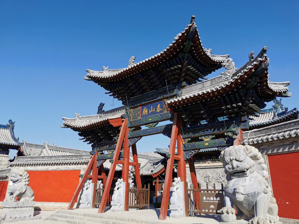 泰山廟坐落于忻州古城內(nèi),又名東岳廟。創(chuàng)建于北宋時期,現(xiàn)存為明清時代遺構(gòu)。明代嘉靖年間擴建,清同治三年(1864年)重修。坐北向南,東西31.3米,南北73米。泰山廟建筑宏大,從北到南,有大殿、獻殿(過殿)、戲臺(樂樓)、山門、影壁。兩側(cè)有鐘亭、鼓亭、牌樓。戲臺與獻殿中原有三思橋。2007年,泰山廟被忻州市人民政府公布為市級文物保護單位。