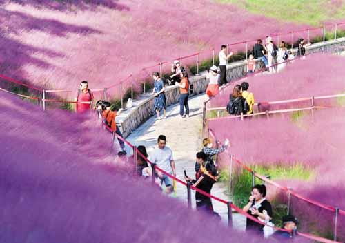 金秋時(shí)節(jié),福建省福州市牛崗山公園和鶴林生態(tài)公園里的粉黛亂子草進(jìn)入觀賞季,成片的“粉色海洋”如夢幻花海,吸引游客和攝影愛好者前來觀賞拍攝。圖為10月11日,游客在福州牛崗山公園游玩。 新華社記者 魏培全 攝
