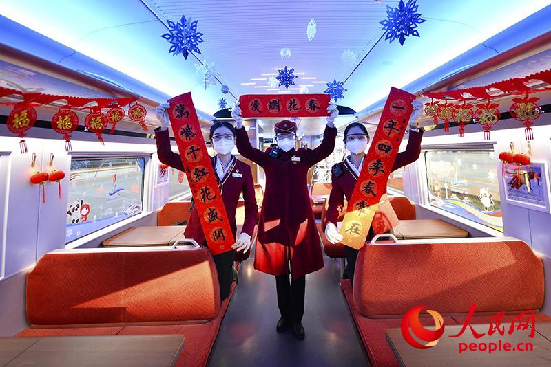 2021年春運(yùn)是疫情防控常態(tài)化下的首個(gè)春運(yùn),全國上下提倡就地過年,鐵路部門科學(xué)調(diào)整運(yùn)力,努力實(shí)現(xiàn)“平安春運(yùn)、有序春運(yùn)、溫馨春運(yùn),讓旅客體驗(yàn)更美好”的春運(yùn)目標(biāo)。2021年2月4日,正值北方小年,同時(shí)也是北京2022年冬殘奧會(huì)開幕倒計(jì)時(shí)一周年,北京局集團(tuán)公司北京客運(yùn)段京張高鐵車隊(duì)擔(dān)當(dāng)?shù)腉8881次列車始發(fā)前,列車工作人員用窗花等裝飾品布置車廂,打造溫馨的出行環(huán)境,營造濃濃的“年味”。(圖片來源:北京鐵路局集團(tuán)公司北京客運(yùn)段 毛衛(wèi)華 攝)