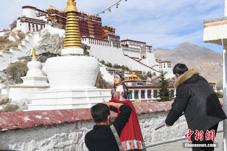 3月15日,游客在拉薩藥王山觀景臺(tái)身著藏族傳統(tǒng)服飾拍照留念。 中新社記者 貢嘎來松 攝