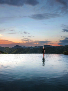 白天,游人可以搭乘索道登上葛仙山,行在山中,可見清泉瑩然,苔蘚盈階、云海翻騰,可聽泉水響動(dòng),天色如夢變幻。葛仙山的翠竹、樹木極多,是一道天然的屏障,趕在落日之前,快步來到葛仙村無邊泳池,赴一場“橘色云朵+藍(lán)色池水”的浪漫。