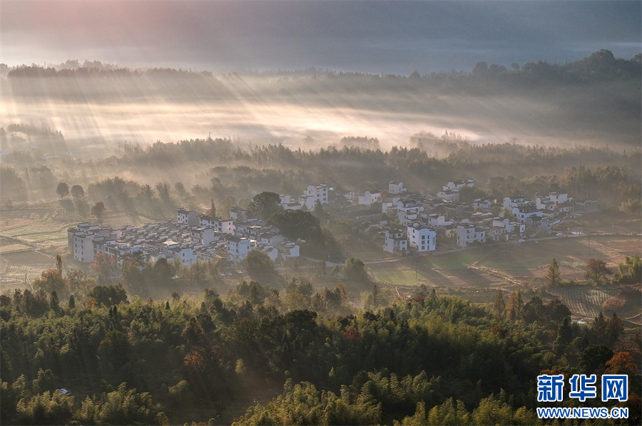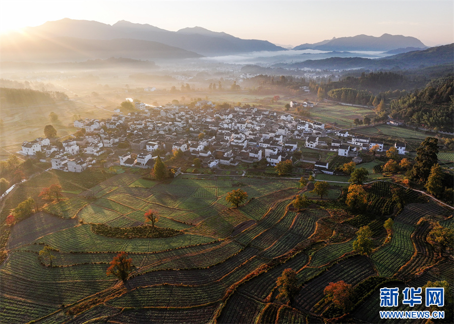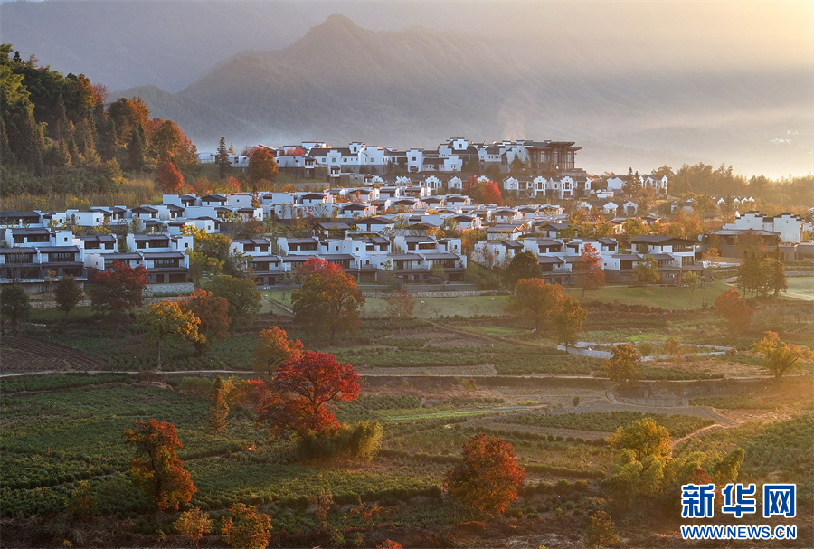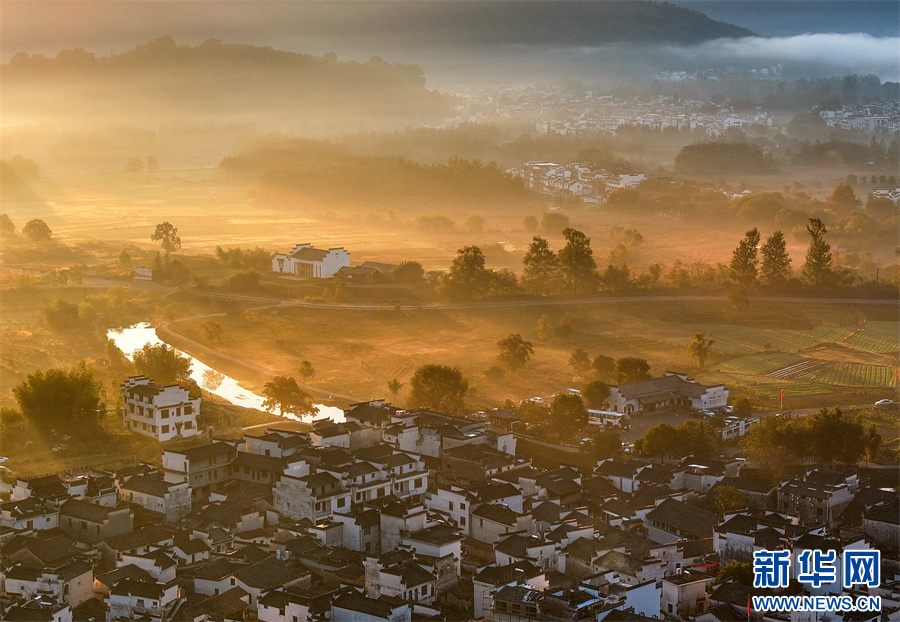 當(dāng)日,安徽省黃山市黟縣宏村、盧村等地晨霧縹緲,秋色斑斕,粉墻黛瓦掩映其中,宛如一幅幅繽紛多彩的油畫。 新華網(wǎng)發(fā)(施亞磊 攝)
