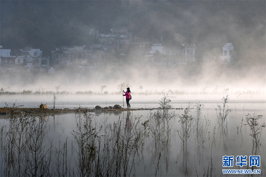 11月1日,在安徽省黃山市黟縣宏村鎮(zhèn)奇墅湖拍攝的秋日晨景。