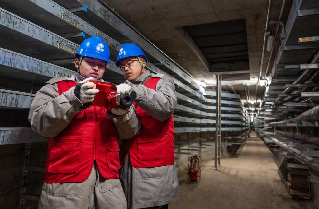 電力工作人員在崇禮冬奧核心區(qū)地下管廊巡查