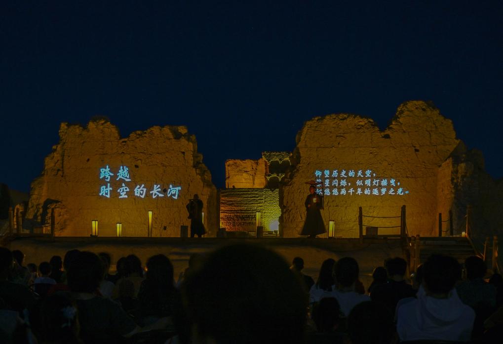 深藍色夜幕下,兩排戶外燈照亮高大殘舊的城墻。身著僧侶服飾的演員雙手合十、懷抱經(jīng)卷,從夜色中走來。時鐘隨著他的朗誦,仿佛回轉(zhuǎn)到佛教鼎盛期的唐代西域。在舞臺前方席地而坐的游客,看得如醉如癡。