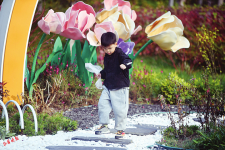 8.白石子、黑片石搭配打造的小路上,小朋友玩得不亦樂(lè)乎。