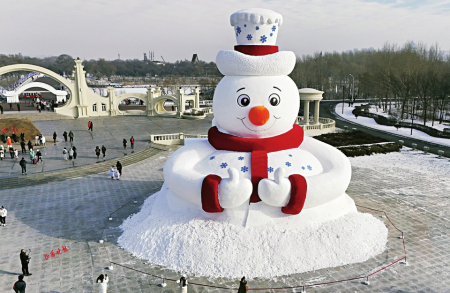 12月8日,哈爾濱今冬第一個大雪人“雪人先生”在太陽島風(fēng)景區(qū)落成。大雪人高20米,用雪量4000立方米。圖為12月9日在哈爾濱太陽島風(fēng)景區(qū)正門廣場拍攝的大雪人(無人機照片)。