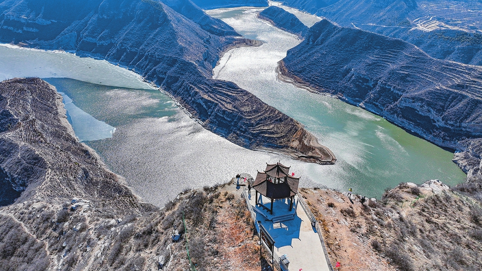 3月16日,古交市緊鄰汾河二庫的角子崖景區(qū),游人正在新建的觀景亭上體驗(yàn)大自然的神奇。伴隨著春天的腳步,近日角子崖景區(qū)內(nèi)的汾河呈現(xiàn)出春日里獨(dú)有的“冰水交融”景觀,吸引眾多游客前來觀賞。