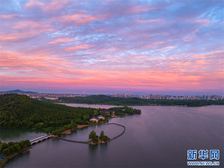 近日,安徽省池州市平天湖上空出現(xiàn)絕美朝霞景觀。新華網(wǎng)發(fā)(饒治國(guó) 攝)