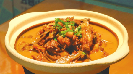 制作過(guò)程處處是講究,先泡發(fā)臺(tái)蘑、處理雞塊,用十幾種調(diào)料煸炒雞塊,再與泡發(fā)好的臺(tái)蘑小火慢燉40分鐘,讓山珍的鮮味與雞肉的醇香充分融合,最后大火收汁。這道菜將臺(tái)蘑鮮香與雞肉醇厚完美平衡,湯汁濃郁不膩。