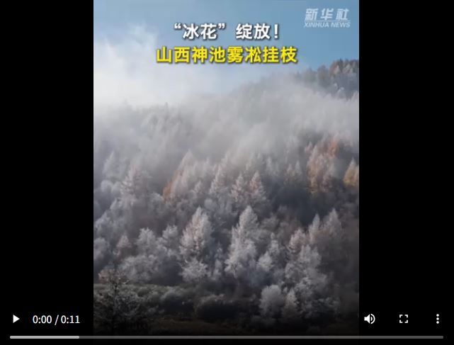 初冬時節(jié),山西神池國家登山步道出現(xiàn)霧凇景觀。金色的樹枝上掛滿冰晶,微風徐來,霧凇輕盈搖曳,還有牛羊在山坡上悠閑地吃草。霧凇宛如一層白色的薄紗,將整個森林籠罩其間,如夢如幻。