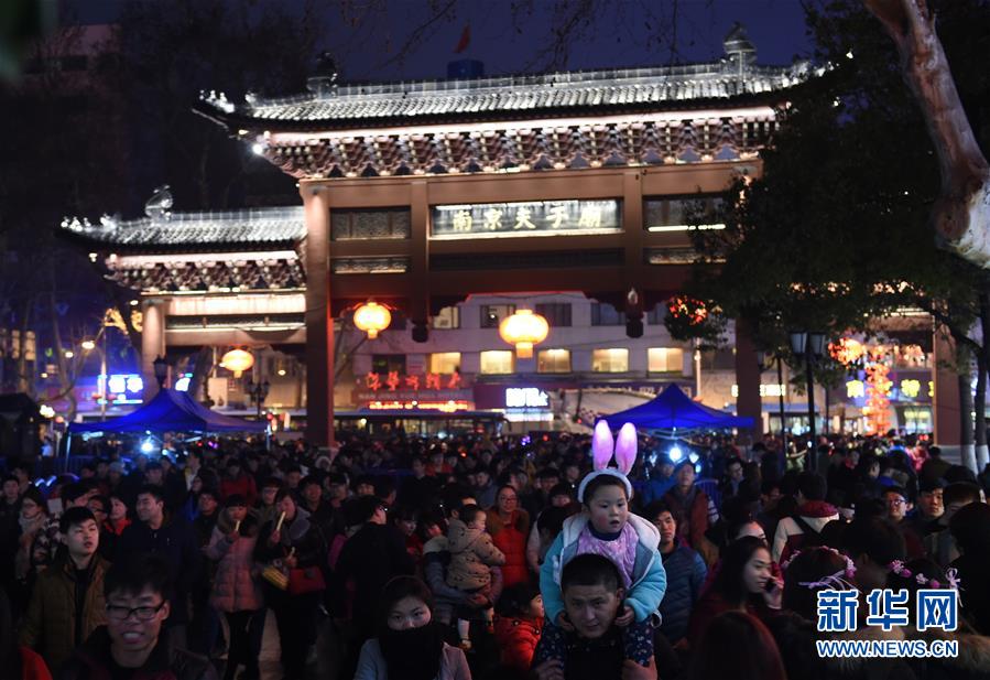 2月22日晚,游人在夫子廟景區(qū)觀燈游玩。當晚,在江蘇南京夫子廟秦淮風光帶舉辦的秦淮燈會彩燈齊放,人們前來觀燈鬧元宵。 新華社記者孫參攝