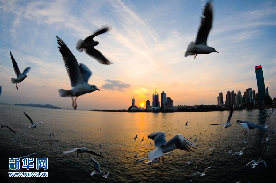 1月10日,水鳥在青島棧橋景區(qū)一帶飛翔。當(dāng)日,山東省青島市天氣晴好,黃昏時(shí)分沿海一帶景色迷人。 新華社發(fā)(王海濱 攝)