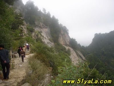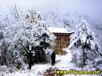 北武當(dāng)山主峰四周幾乎都是陡壁懸崖,只有一條人造“天梯”可攀。來到山腳下,過五里黃土、五里沙路,便是1400余級就山鑿筑的石階,凡險峻之處,設(shè)有鐵索扶手。石階一線疊置,從下仰視,宛如“天梯”。游人攀登,每一步都可聽到悠揚(yáng)頓挫的“石音”,形成獨(dú)特的“石樂”絕景。沿著石階,奇松異石、廟宇石刻,掩沒在蔥郁的山林植被之中,相間點(diǎn)綴,相映成趣。主要的山石景觀有:古猿望日、石豬受難、九龍出洞、石象守山、天壺傾露、石羊朝圣、石龜下蛋、石虎、石蛤蟆、龜蛇斗智等。最令人稱奇的是“龜蛇斗智”奇觀,相傳神龜和青蛇不安心修道,互相格斗,經(jīng)過七七四十九天的麈戰(zhàn),神龜節(jié)節(jié)敗退,青蛇步步緊逼。其時,恰逢真武大帝返宮,見狀,輕輕用手指一點(diǎn),龜蛇便動彈不得,從此永久停留在這里,成千古一絕——“蛇石”虎視眈眈,“龜石”尾臨懸崖,萬斤重石,峭立崖畔,用力一推或經(jīng)風(fēng)一吹,便搖搖欲墜,令人心懸,所以又稱風(fēng)動石,為我國罕見的景觀之一。主要的奇松景觀有:鴛鴦松、迎客松、托天松、母子松等。最使人嘆為觀止的是“擎天探海松”,其松立于石階半道,樹身技分兩杈,一直刺青天,一枝瞰群峰。近金頂?shù)悄咸扉T石階,旁邊陡崖上刻有“喬松”二字,據(jù)載為清代道光年間永寧州牧王繼賢手跡?,F(xiàn)存喬松樹樁直徑近1米,可以想見其昔日雄姿。主要的懸崖峭壁有:千仞壁、舍身崖、鷹嘴崖等。還有呈垂直分布的植被,其色彩和花期隨季節(jié)變化,給北武當(dāng)山披上了“春粉、夏艷、秋紅、冬白”的盛裝。登臨武當(dāng)之巔,一覽眾山,但見遠(yuǎn)山蒼茫,近日含黛,松風(fēng)撲面,白云飄逸;只聞松濤陣陣,山泉潺潺,鳥語唧唧,似琴弦輕撥;夏秋之季,如晴空萬里,金頂之下,叢林景觀相間,似七彩織錦;白云遠(yuǎn)處,群山連綿,猶如萬龍翻騰,極為壯觀。