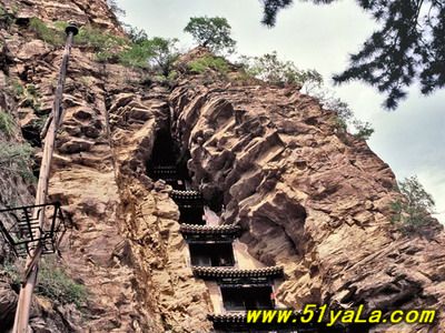 北洞是主體建筑部分。中區(qū)有大殿三間,座北向南。原為道教三清塑像,后被佛教改成三世佛。左右耳殿,另有東西配殿各三間,南閣一間。東側(cè)迎面山壁上,自然形成龐大的三角形石縫,內(nèi)有天然石洞,景觀奇特。石縫上端,外建五層樓閣。依崖開鑿卯洞,梁架結(jié)構(gòu)與崖石交接構(gòu)筑,建造精巧。閣內(nèi)設(shè)有鐵索,扶鐵索可攀援而上。在閣的東邊又有一洞,內(nèi)建殿三間,名九仙女閣,塑九仙女像。箭閣外塑趙杲泥像,頭頂距石崖僅二指半,故舊稱“趙杲觀,離天二指半”。再往南,就是趙杲觀最險(xiǎn)峻的景觀了。峭峰高處,半山腰中,山洞前面,建樓三間。一眼望去,高閣懸空,上峭崖,下絕壁,左右山石如刀削。上下左右根本無(wú)路可通。山洞中垂下一條長(zhǎng)約20米的鐵索,成了進(jìn)洞的唯一途徑。只有勇敢的虔誠(chéng)者或探險(xiǎn)者,方可垂直攀索而登,一般人只能望樓興嘆,故鐵索被譽(yù)為“仙閣云梯”。三層樓建筑后依山洞,前為磚木結(jié)構(gòu)。上層內(nèi)塑太上老君、無(wú)始天尊、通天教主。中層內(nèi)塑關(guān)圣帝君。下層供修持者居住。當(dāng)時(shí)修筑情景,真令人難以想像。北洞群落,地形險(xiǎn)要,峰巒競(jìng)秀,古木參天,峭峻幽邃,設(shè)計(jì)大膽,造型奇特。人夸“雁北懸空寺,不及代州趙杲現(xiàn)”說(shuō)的并不過(guò)分。