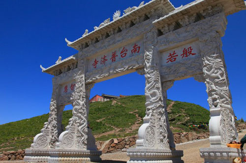 五臺(tái)山的南臺(tái)名喚錦繡峰,又名仙花山,海拔2485米。整個(gè)山勢(shì)像一匹駿馬靜臥群山之中。山峰聳峭,孤立挺拔,如果說(shuō)其他四個(gè)臺(tái)是連襟而立或裙帶關(guān)系的話,南臺(tái)則是貌美如花、孤傲冷峻的公主?!肚鍥錾街尽访枋觯骸吧椒迓柷?,煙光凝翠,細(xì)草雜花,千巒彌布,猶鋪錦然,故以名焉”。山頂寺院叫普濟(jì)寺,內(nèi)供智慧文殊。