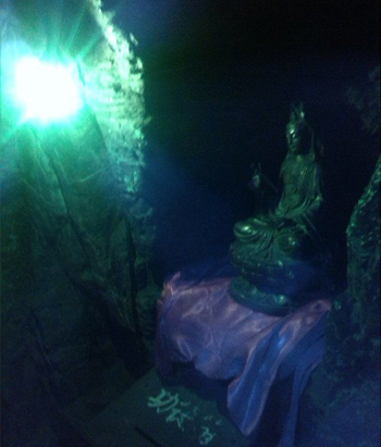 千佛洞,分內(nèi)外兩洞,外洞大而明,內(nèi)洞小而幽,中間有一個扁圓形孔穴相通。內(nèi)洞中,可以容納五至七人。內(nèi)洞的洞壁上,山巖經(jīng)水溶化,產(chǎn)生許多乳石及石筍,夾有各種色質(zhì),猶如人體心肝五臟,洞形又呈葫蘆形狀,后人便稱之為母腹。佛教宣揚進(jìn)入小洞就是投胎佛母,受其恩育,復(fù)出小洞就是洗掉人生一切煩惱,獲得無上歡樂幸福。