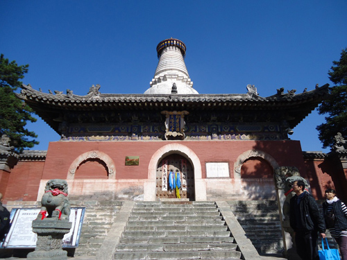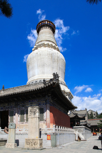 塔全稱為釋迦牟尼舍利塔,俗稱大白塔。塔身撥地而起凌空高聳,在五臺山群寺簇擁之下頗為壯觀,人們把它做為五臺山的標志。此塔通高七十五點三米,環(huán)周八十三點三米。塔基為正方形,塔身狀如藻瓶,粗細相間,方圓搭配,造型優(yōu)美。塔頂蓋銅板八塊成圓形,按乾、坎、艮、震、巽、離、坤、兌等八卦地位安置。塔頂中裝銅頂一枚,高約五米,覆盤二十一米多,飾有垂檐三十六塊,長兩米多;每塊垂檐底端掛風鐘三個,連同塔腰風鐘在內,全塔共有二百五十二個。風歡鈴動,叮鐺作響。