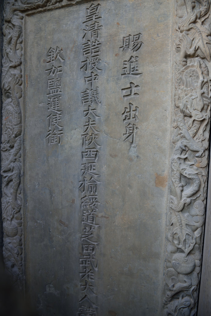 配坊實際上是一座功名石牌坊,上面刊載著武訪疇一家四代人的姓名及朝廷贈封的官爵,咸豐六年(1856)由武訪疇修建。這座石雕牌坊與其它牌坊最大的區(qū)別就是沒有題刻坊名,因此只能稱之為配坊。坐北向南,為四柱三間三樓單檐歇山頂結(jié)構(gòu),牌樓高8米,寬12米,坊體坐落在近1米高的長方形臺基上,立柱仍然采用夾柱石固定。坊頂覆蓋青瓦,正脊飾石雕貔貅裝飾,飛檐翹角,明樓檐下為“圣旨”牌,當(dāng)心間設(shè)兩層小字板,第一層題刻:“贈資政大夫曾祖父廷桂,贈夫人曾祖母李氏;誥贈資政大夫祖父秉壁,誥贈夫人祖母吳氏;誥贈資政大夫父烈,誥封夫人母朱氏。陜西分巡延榆綏兵備道、加四級武訪疇謹(jǐn)建?!钡诙宇}刻“大清咸豐六年歲次丙辰仲夏上院榖旦”。武訪疇借建坊要弘揚(yáng)祖輩陰德,而祖輩的姓氏大名又不能題刻在母親的節(jié)孝牌坊上,所以,他必須另建一坊才能完整地表達(dá)心愿。實際上,這就是建造配坊的真正目的。也正因此在配坊題刻“龍光錫寵”、“鳳詔褒榮”、“克成先志”、“重裕后昆”等。