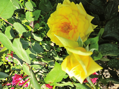 花廊。黃木香的單朵花雖小,但成千上萬朵手牽著手簇?fù)碇_放,整株植物像黃金鍛造的噴泉,金黃色花朵如水流般潺潺而下,如同春日的暖陽帶給人舒服的感受。它不僅好看,湊近了還能聞到陣陣清香,不同于牡丹的濃香,也不同于桂花香帶著的甜膩,它的氣味淡雅清新,隨著輕風(fēng)飄散至各處。