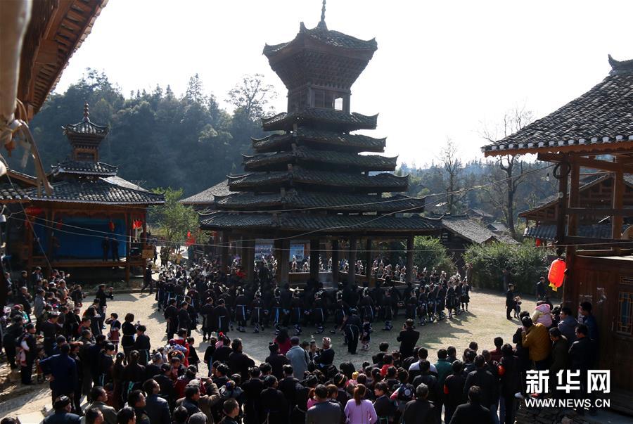 2月17日,貴州省黔東南苗族侗族自治州黎平縣巖洞鎮(zhèn)述洞村開展一年一度的“鼓樓之宗”活動(dòng)。侗族老人在當(dāng)?shù)刈罟爬系墓臉恰冀ㄓ诿鞔莫?dú)柱鼓樓講述侗族遷徙歷程,告誡大家要敬老尊賢、和睦相處、團(tuán)結(jié)友善,侗族青年男女身著節(jié)日盛裝圍著鼓樓一邊踩歌堂,一邊唱遷徙古歌,之后在鼓樓旁進(jìn)行“侗族大歌”對(duì)唱,感懷族群遷徙的歷史,傳承傳統(tǒng)文化。新華社發(fā)(楊代富 攝)