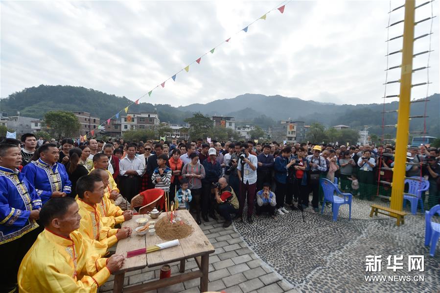 農(nóng)歷十月十五前后,福建西部武平縣各山村陸續(xù)進入農(nóng)閑時節(jié)。按照當?shù)仫L俗,不同村子各自擇日舉辦民間活動,其中較有代表性的就是“上刀山”絕技。“上刀山”絕技在閩西山村流傳已有數(shù)百年歷史,表演者需光腳順著磨得鋒利閃亮的36把鋼刀,攀登至8米高的杉木柱子頂部,接受長者祝福,祈求風調(diào)雨順、五谷豐登。新華社記者 宋為偉 攝
