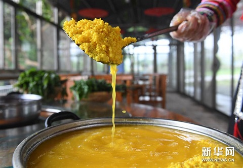 上五圖:4種不同植物及其色素染成的糯米和原色糯米;下左圖:4種不同植物色素染成的糯米和原色糯米;下右圖:在廣西上林縣巷賢鎮(zhèn),兩名壯族村民在查看一桶剛剛蒸熟的五色糯米飯(拼版圖片,3月25日攝)。 每年“壯族三月三”到來之際,廣西的壯族同胞都有蒸制五色糯米飯迎接節(jié)日的習俗,以祈禱五谷豐登,五福臨門。這些五色糯米飯,主要采用天然植物萃取色素,將糯米分別浸泡到紫、黃、紅、黑4種不同植物色素的水里,充分染色后,與原色糯米一起蒸熟而成。色澤鮮艷、清香誘人的五色糯米飯,是“壯族三月三”接待來客時必不可少的傳統(tǒng)美食。新華社記者 陸波岸 攝
