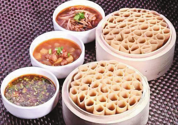 莜面栲栳栳。莜面栲栳栳又叫“莜面窩窩”,是過去老百姓農(nóng)忙時節(jié)為省事普遍愛做的一種飯食。它工藝講究,成形美觀,口感筋道,再加上“羊肉臊子臺蘑湯”,真可謂“一家吃著十家香”,難怪就連康熙皇帝朝拜五臺山時,也以品此為人生快事。其做法是:和面時加以燒開的水,用筷子攪拌成面絮,趁熱將其揉成光滑的面團(tuán);取一小塊放在光滑的面板上,用手掌使巧勁一搓,然后撕起來往食指上繞,卷成中間空的小卷,豎在蒸籠里;最后放在沸水鍋上蒸10分鐘即熟,蒸時要注意火候,火候不到會不熟,蒸得過火則軟癱立不起來,吃時味欠色減。