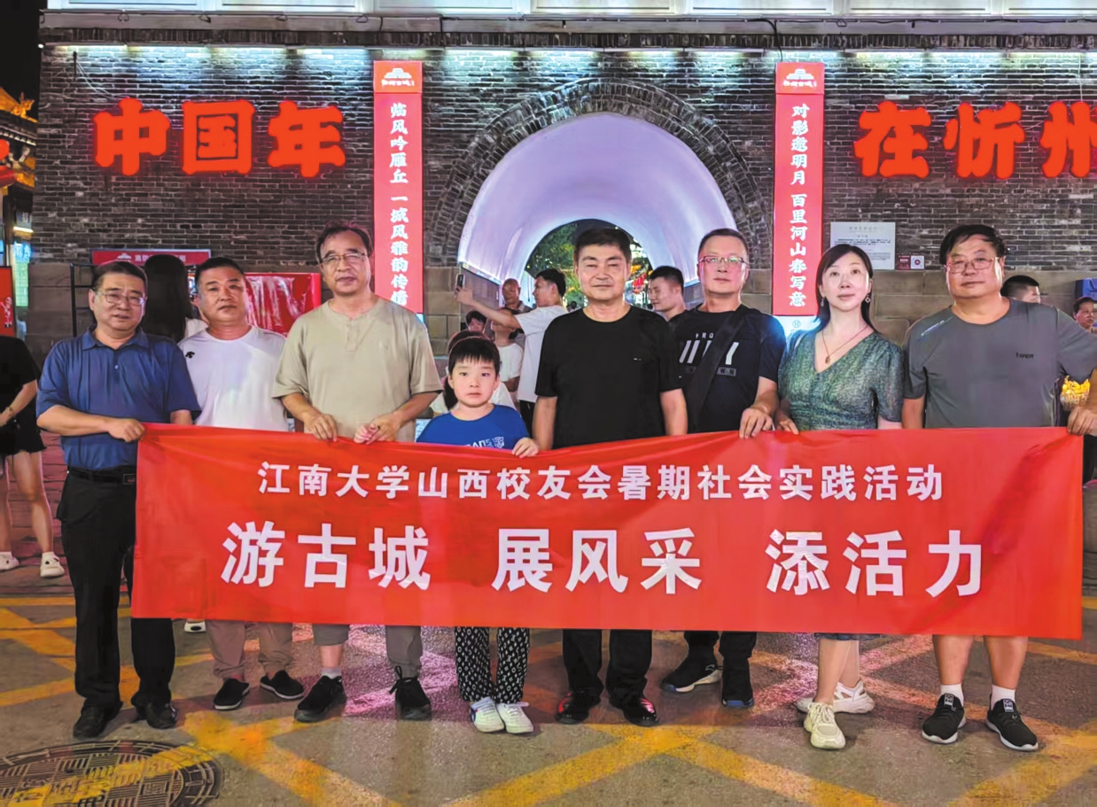 夏日的傍晚,落日熔金,忻州古城城樓如剪影般佇立,與暮色深沉交融。校友們沿著石板路緩緩前行,沿街仿古建筑的恢宏氣勢深深地吸引著大家。夜幕下的古樓在彩燈的映照下更顯雄偉,校友們撐起“游古城展風(fēng)采添活力”的紅色會標(biāo)合影留念,鏡頭記錄下了我們相聚的寶貴瞬間。