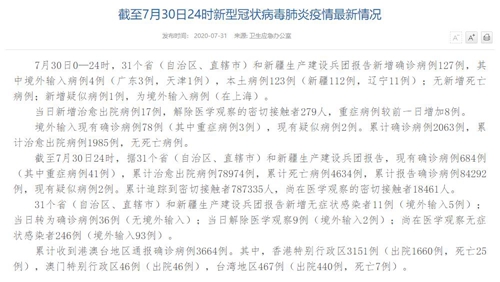 人民網(wǎng)北京7月31日電(董童)國家衛(wèi)生健康委于今日在官網(wǎng)發(fā)布的《截至7月30日24時新型冠狀病毒肺炎疫情最新情況》(以下簡稱“情況”)提出,7月30日0—24時,31個?。ㄗ灾螀^(qū)、直轄市)和新疆生產(chǎn)建設(shè)兵團報告新增確診病例127例,其中境外輸入病例4例(廣東3例,天津1例),本土病例123例(新疆112例,遼寧11例);無新增死亡病例;新增疑似病例1例,為境外輸入病例(在上海)。當日新增治愈出院病例17例,解除醫(yī)學(xué)觀察的密切接觸者279人,重癥病例較前一日增加8例。