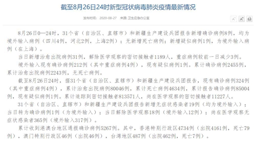人民網(wǎng)北京8月27日電(董童)國家衛(wèi)生健康委于今日在官網(wǎng)發(fā)布的《截至8月26日24時新型冠狀病毒肺炎疫情最新情況》(以下簡稱“情況”)提出,8月26日0—24時,31個?。ㄗ灾螀^(qū)、直轄市)和新疆生產(chǎn)建設兵團報告新增確診病例8例,均為境外輸入病例(四川4例,河北2例,上海2例);無新增死亡病例;新增疑似病例1例,為境外輸入病例(在上海)。當日新增治愈出院病例31例,解除醫(yī)學觀察的密切接觸者1189人,重癥病例較前一日減少3例。